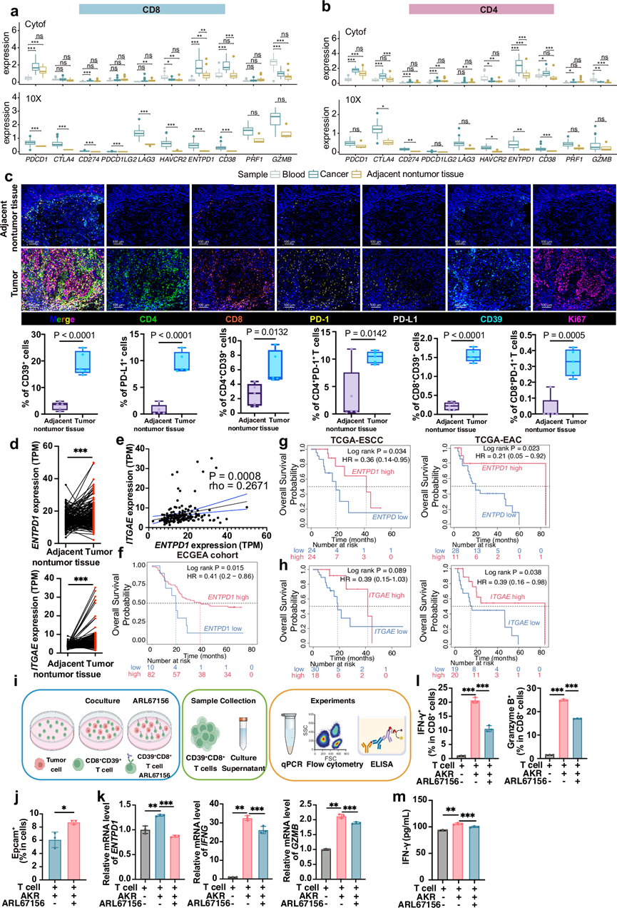 (a-b)分析ESCC中CD8+ T细胞和CD4+T细胞的功能性标志物表达。(c) mIHC分析。(d) ESCC肿瘤组织与邻近非肿瘤组织中ENTPD1和ITGAE的表达水平(e) ENTPD1表达水平与ITGAE表达水平之间的相关性。(f-h) Kaplan-Meier生存分析。(i) T 细胞和肿瘤细胞共培养模式示意图。(j) 与CD8+T细胞共培养后,肿瘤细胞的存活率。(k-m) qRT-PCR分析。