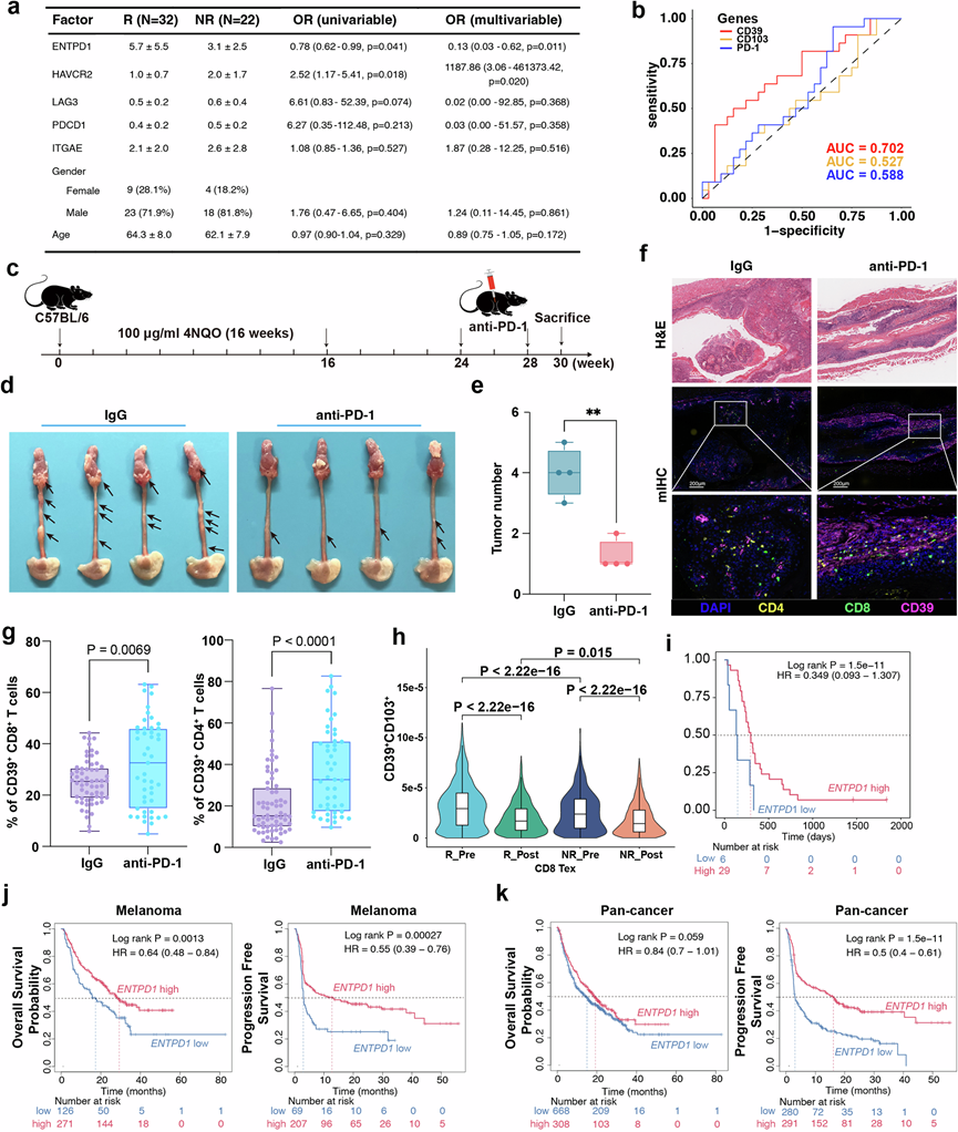 (a) .单变量和多变量Cox回归分析评估免疫治疗反应与T细胞耗竭标志物之间的关联。(b) CD39、CD103和PD-1表达预测免疫治疗反应的AUC值。(c) 4NQO诱导的ESCC小鼠模型示意图。(d)食管组织分析。(e) 经抗PD-1治疗或未治疗的4NQO诱导的ESCC小鼠食管中肿瘤的数量。(f) 免疫组化染色分析。(g) T细胞的比例分析。(h) CD39和CD103的分布图。(i-k) Kaplan -Meier生存曲线。