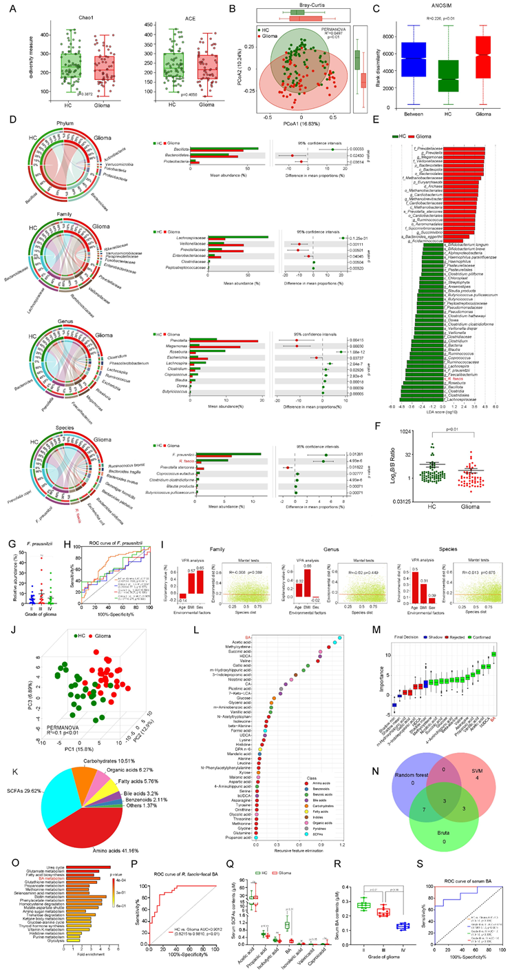 (A) α多样性分析。(B) β多样性的PCoA。(C) ANOSIM分析。(D) 主要肠道菌群的分布。(E) LDA分数。(F) B/B ratio 分析。(G) F. prausnitzii在不同级别胶质瘤患者中的丰度。(H) F.Prausnitzii在胶质瘤患者中的鉴别价值。(I) VPA分析和Mantel测试。(J) 粪便代谢物的OPLS-DA分析。(K) 不同种类粪便代谢产物的比例。(L-M) 通过粪便代谢组的SVM和Boruta识别出对区分胶质瘤患者和健康对照者贡献最大的生化数据。(N)维恩图。(O) 胶质瘤患者相关代谢物的MSEA。(P) ROC分析BA和R. faecis联合鉴别胶质瘤患者和HC的效能。(Q) 检测胶质瘤患者和HC血清SCFA含量。(R) 血清BA含量。(S)生存分析。