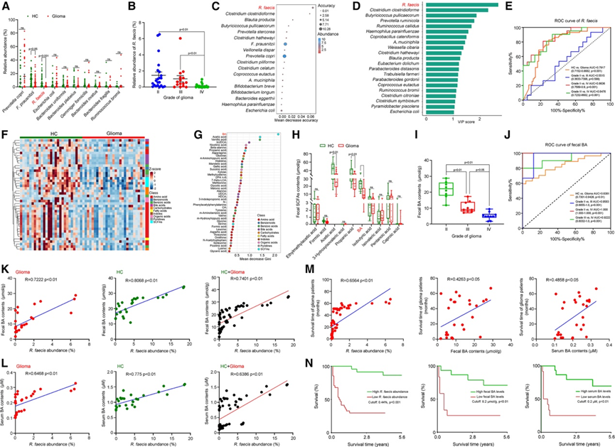 (A) 健康对照组和胶质瘤患者中不同物种的丰度。(B) 不同级别胶质瘤中R. faecis的丰度。(C) 通过随机森林分类法鉴定的肠道微生物群物种。(D) PLS-DA 的 VIP 评分。(E) ROC 分析R. faecis在区分神经胶质瘤患者(N = 58)与健康对照组(N = 79)以及低级别与高级别病例(Ⅱ/Ⅲ/Ⅳ级)方面的表现。(F) 粪便中鉴定的代谢物(VIP ≥ 1,p < 0.05)的热图。(G) 粪便代谢组的随机森林分类。(H) 粪便代谢组的随机森林分类。(I) 不同级别胶质瘤患者的粪便BA含量。(J) ROC 分析粪便 BA 在区分胶质瘤患者与健康对照组(N = 27/组)以及低级别与高级别病例(Ⅱ/Ⅲ/Ⅳ级)方面的差异。(K) R.faecis丰度与粪便 BA之间的 Pearson 相关性。(L) R. faecis丰度和血清BA含量之间的Pearson 相关性。(M) 质瘤患者的生存时间分别与R. faecis丰度、粪便和血清 BA 水平之间的 Pearson 相关性。(N) 生存分析。