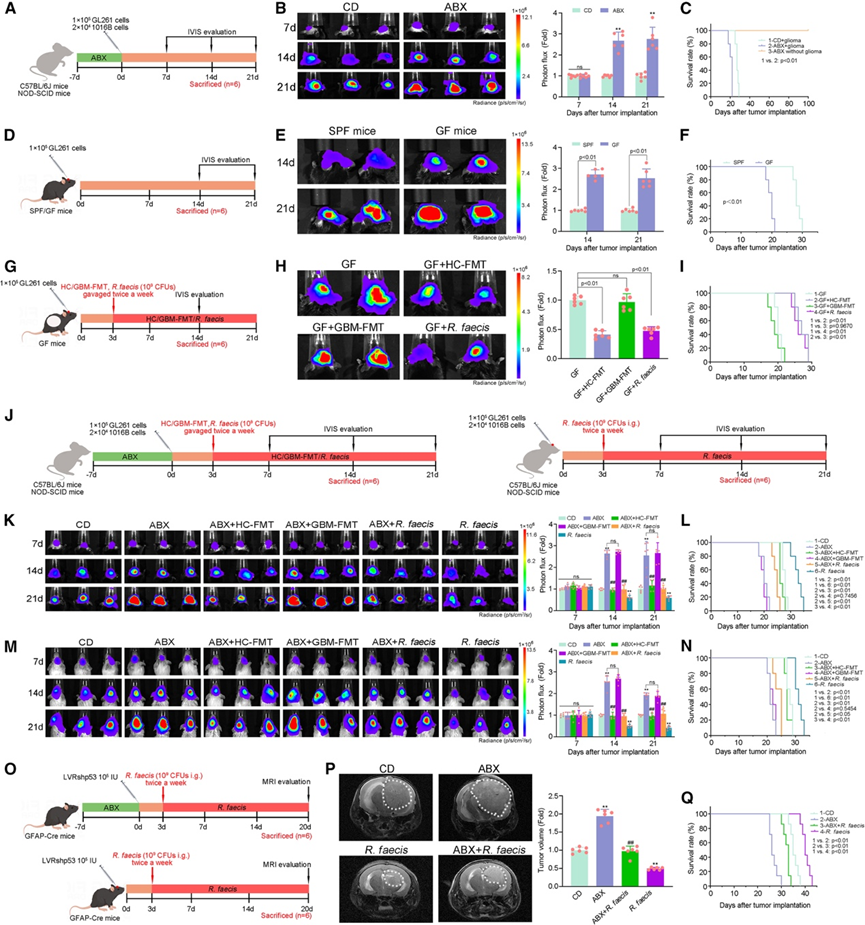 (A, D)小鼠模型建立。(B, E, G, J) 生物发光成像和肿瘤定量分析。(C, F, I, K) 对接受指定治疗的 C57BL/6J 和 NOD-SCID 小鼠进行生存分析。(H) 免疫荧光染色和定量分析。(L-O) LVRshp53 和 SPF/GF 小鼠的治疗方案。(M) 肿瘤的定量分析。(N, Q) 生存分析。(P) 生物发光图像和肿瘤定量。