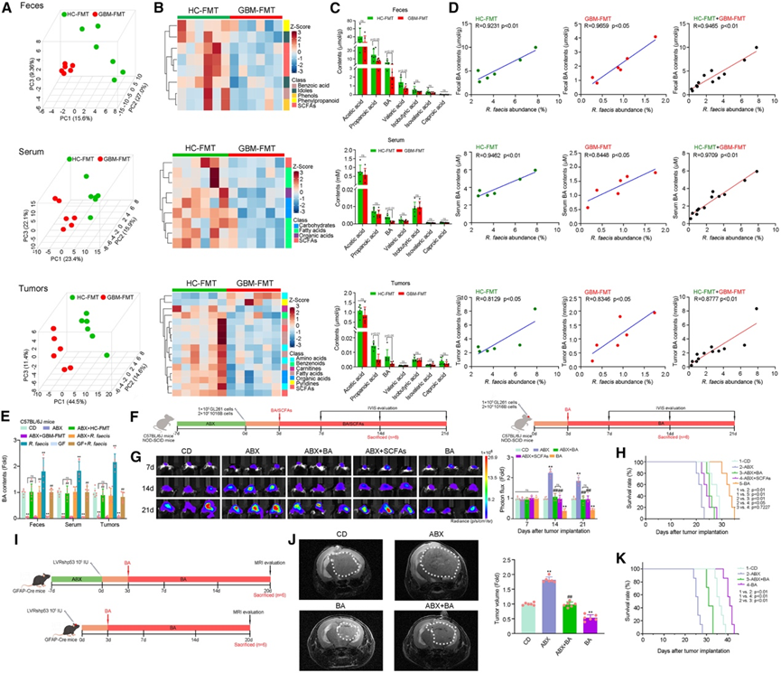 (A) GBM-FMT 和 HC-FMT GF 小鼠粪便/血清/肿瘤中代谢物的 OPLS-DA。(B) GBM-FMT 和 HC-FMT GF 小鼠的粪便/血清/肿瘤中鉴定的代谢物的热图。(C)在 GBM-FMT 和 HC-FMT GF 小鼠的粪便/血清/肿瘤中检测到 SCFA水平。(D) HC-FMT、GBM-FMT 和 HC-FMT + GBM-FMT GF 小鼠的粪便/血清/肿瘤中 R. faecis丰度与 BA 含量之间的 Pearson 相关性。(E) 经指定处理的 C57BL/6J 小鼠的粪便/血清/肿瘤中的BA含量。(F) C57BL/6J 和 NOD-SCID 小鼠接受 SCFA 或 BA 治疗的方案。(G) 生物发光图像和肿瘤定量。(H) 生存分析。(I) LVRshp53 小鼠的治疗方案。(J) LVRshp53 小鼠的 T2 加权成像和肿瘤定量。(K) LVRshp53 小鼠的生存分析。