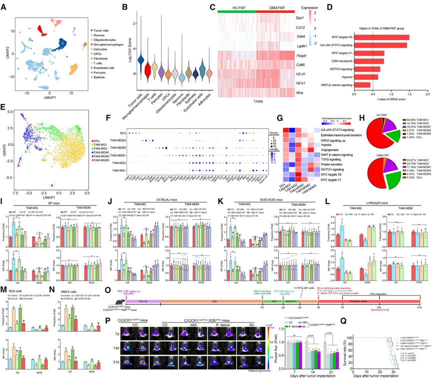 (A)SnRNA-seq 均匀流形近似和投影(UMAP)图,按在患有胶质瘤的 GBM-FMT 和 HC-FMT GF 小鼠的肿瘤中观察到的细胞类型着色。(B) 小提琴图显示不同细胞类型中 CNV 得分的分布。(C) 热图显示了 HC-FMT 和 GBM-FMT GF 小鼠 TAM 中所示恶性肿瘤相关基因的表达。(D) 根据 GBM-FMT GF 小鼠 TAM 中的基因集变异分析(GSVA)进行差异通路富集分析。(E) UMAP 图显示了 TAM 的聚类情况。(F) 散点图显示了用于识别细胞聚类类型的“特征”基因的表达情况。(G) 热图展示了 TAM-MG1/TAM-MG2/TAM-MDM1/TAM-MDM2/TAM-MDM3/DC 中的 GSVA 富集途径。(H) 热图展示了 TAM-MG1/TAM-MG2/TAM-MDM1/TAM-MDM2/TAM-MDM3/DC 中的 GSVA 富集途径。(I-L)流式细胞分析。(M-N) 检测BV2 细胞和HMC3 细胞中 IL-6/iNOS 的频率和 MFI。(P) 生物发光图像和肿瘤定量。(Q)生存分析。