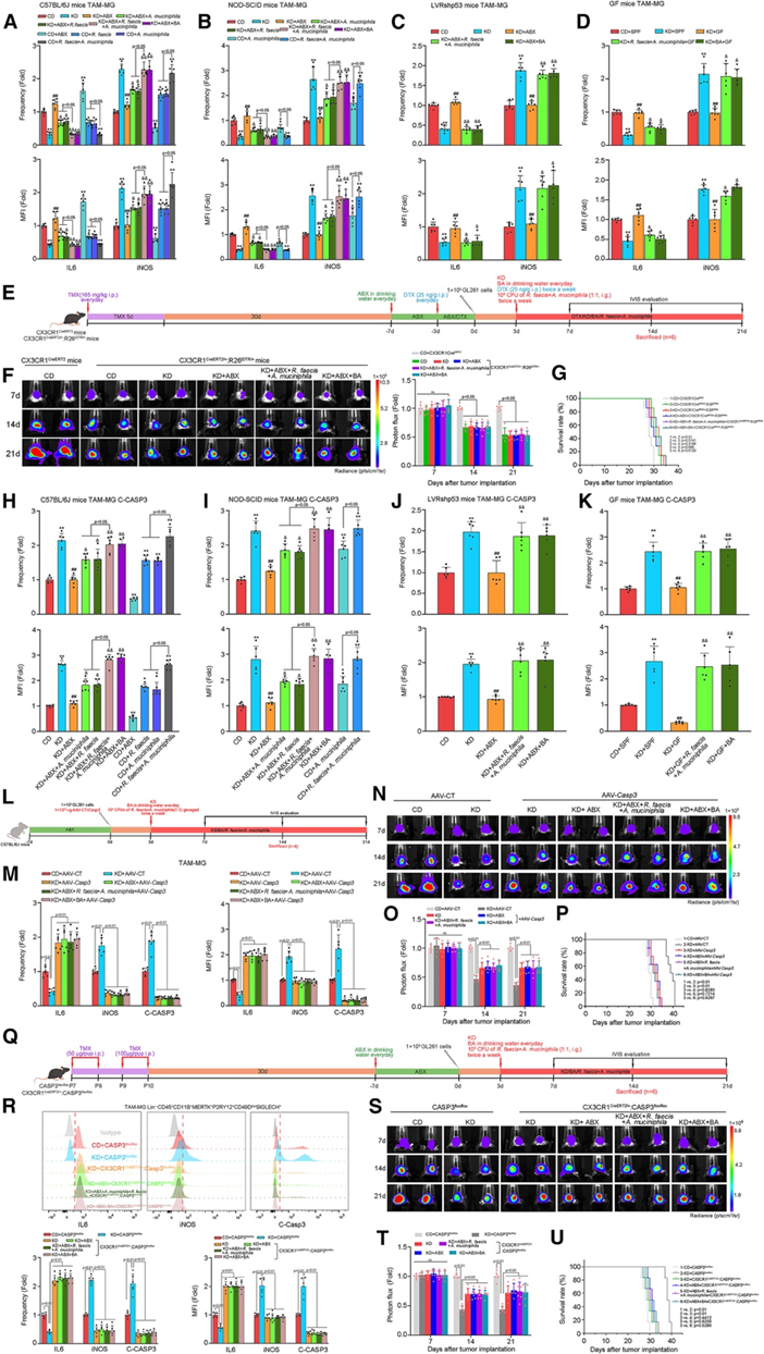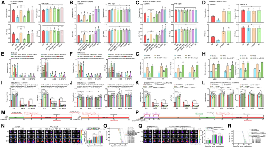 (A-F)流式细胞分析。(I-J) 流式细胞分析 AAV- Casp3治疗的 C57BL/6J 小鼠(n = 6/组)中(I)TAM-MG 和(J)TAM-MDM 中 IL-6/iNOS/C-CASP3 的频率和 MFI。(K-L)流式细胞分析。(M, P)小鼠模型建立。(N, Q) 生物发光成像和肿瘤定量分析。(Q-R) 生存分析。