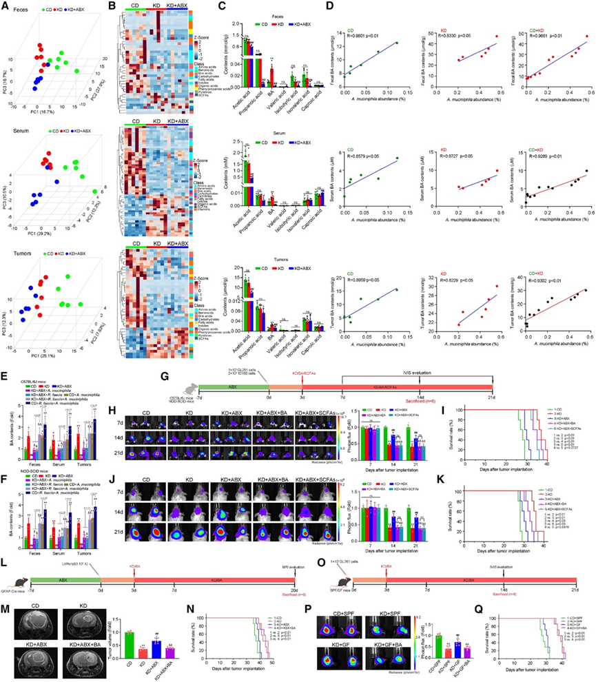 (A) C57BL/6J 小鼠粪便/血清/肿瘤中代谢物的 OPLS-DA 分析。(B) C57BL/6J 小鼠粪便/血清/肿瘤中鉴定的代谢物。(C) 粪便/血清/肿瘤中检测到了 SCFA含量。(D) A. muciniphila丰度与 BA 含量之间的 Pearson 相关性。(E-F) 小鼠的粪便/血清/肿瘤中的BA含量。(G) C57BL/6J 和 NOD-SCID 小鼠的治疗方案。(H,J) 生物发光图像和肿瘤定量分析。(I-K) 生存分析。(L,O) 小鼠的治疗方案。(M) 肿瘤定量。(N, Q) 生存分析。(P) 生物发光图像和肿瘤定量。