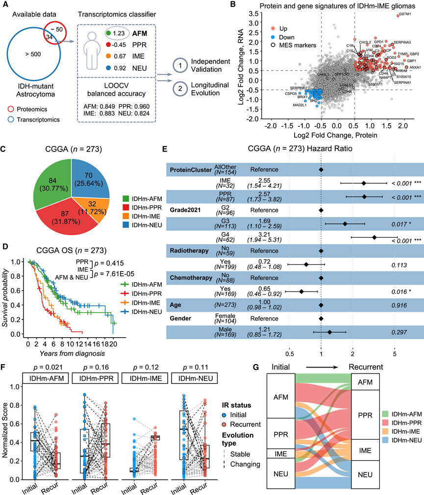 (A) 实验流程。(B) 散点图显示了 IDHm-IME 亚组与所有其他 IDH 突变型星形细胞瘤之间转录组和蛋白质组改变的相关性。(C) 饼图显示使用转录组学分类器在独立 CGGA 队列中分类的蛋白质簇的百分比。(D) Kaplan-Meier 曲线显示 CGGA 中 IDH 突变型星形细胞瘤患者的总生存率。(E) 基于多变量Cox比例风险模型,森林图显示CGGA中IDH突变型星形细胞瘤患者的总生存期风险比(HR)。(F) 基于多变量Cox比例风险模型,森林图显示CGGA中IDH突变型星形细胞瘤患者的HR。(G) 基于多变量Cox比例风险模型,森林图显示CGGA中IDH突变型星形细胞瘤患者的HR。
