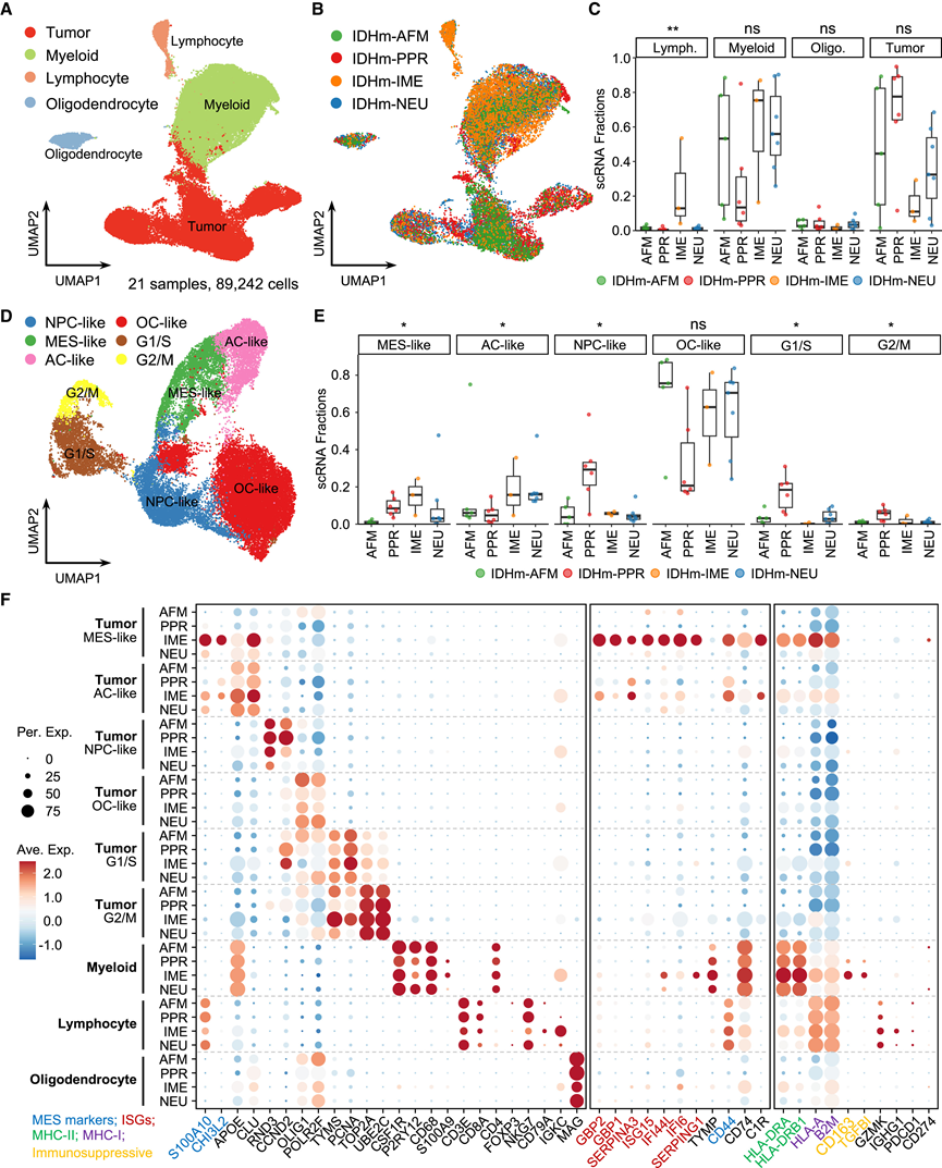 为了区分肿瘤内在信号和微环境信号,他们对来自18例患者的21个IDH突变型星形细胞瘤标本进行了scRNA-seq,这些标本均具有匹配的蛋白质组学数据(3例IME,5例AFM,3例PPR和7例NEU)。他们根据标记基因将总共89242个高质量细胞分为肿瘤细胞、髓系细胞、淋巴细胞和少突胶质细胞群(图3A),并通过检测拷贝数变异确认了肿瘤细胞。比较不同蛋白质聚类中的非恶性细胞,他们观察到IME中淋巴细胞的富集程度显著高于其他组(图3B-C)。