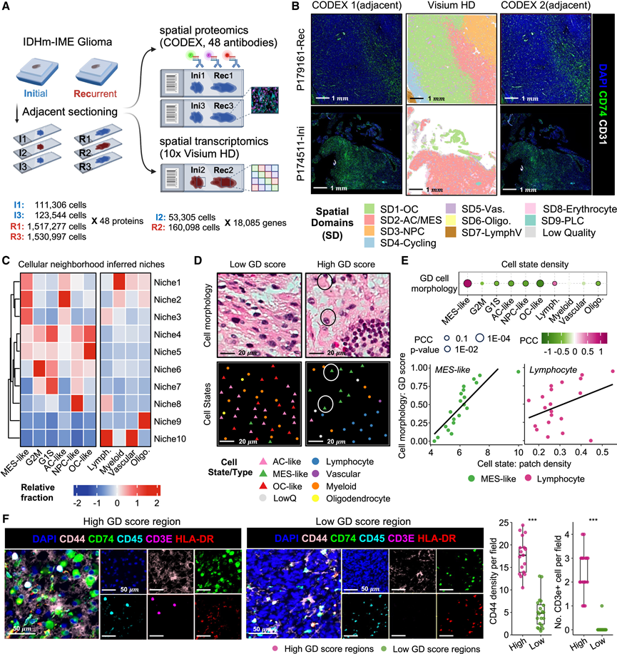 (A) 空间多组学实验设计和样本信息。(B) Visium HD 捕获区域内 CODEX 1、Visium HD 和 CODEX 2 数据的空间匹配。(C) 热图显示了根据细胞邻域分析推断出的10种细胞类型/状态在10个细胞微环境内的共现情况。(D) 代表性图像显示两个示例斑块。(E) GD形态与肿瘤细胞状态和TME细胞类型的相关性。(F) IDH 突变型星形细胞瘤中高 GD 评分区域与低 GD 评分区域的代表性 CODEX 图像。