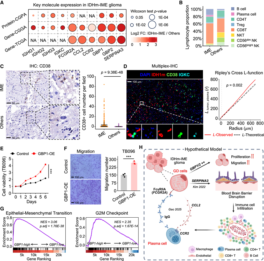(A) 点图显示在三个数据集(蛋白质-CGPA、基因-CGGA 和基因-TCGA)中,IDHm-IME 胶质瘤中免疫相关基因和蛋白质持续上调。(B) 堆积条形图显示 IDHm-IME 胶质瘤与其他 IDH 突变型星形细胞瘤相比淋巴细胞亚型的相对组成。(C) 代表性免疫组化图像显示IME中CD38+浆细胞浸润增加。(D) 代表性多重免疫组织化学 (mIHC) 染色图像显示IME 中IDH 突变型胶质瘤细胞 (IDH1m+) 周围浆细胞 (CD38+IGKC+)的浸润。(E) 使用细胞计数试剂盒-8 (CCK8) 检测过表达 GBP1 的 TB096 胶质瘤细胞的相对增殖情况。(F) 过表达 GBP1 的 TB096 细胞的 Transwell 迁移结果。(G) 基因集富集分析 (GSEA) 图显示CGGA 队列 ( n = 273)中 IDH 突变型星形细胞瘤患者中与GBP1高表达相关的通路。(H) 示意图总结了GBP和其他共表达的免疫相关分子导致免疫细胞浸润和不良预后的机制。