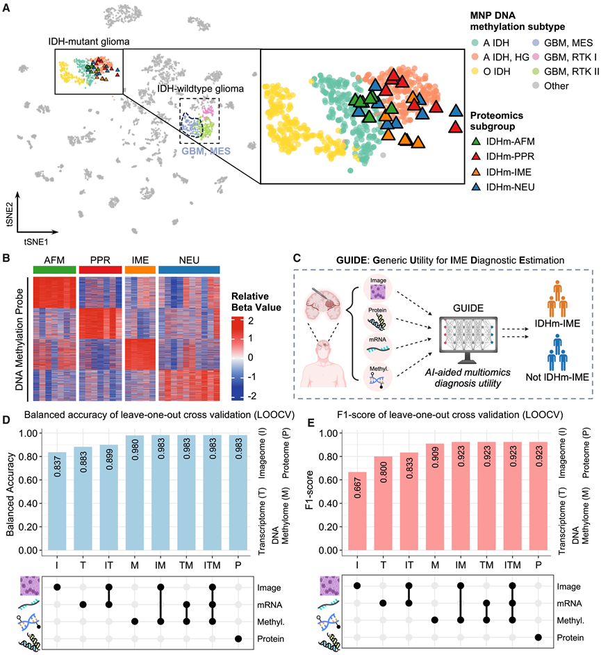 (A) 使用 DNA 甲基化数据,通过t -SNE对新收集的 IDH 突变型星形细胞瘤和分子神经病理学 (MNP) 参考队列进行无监督聚类。(B) 热图显示了四个蛋白质聚类的不同 DNA 甲基化图谱。(C) 应用 GUIDE 从可用的组学数据中检测 IDHm-IME 神经胶质瘤的示意图工作流程。(D-E) 在组学可用性场景下,GUIDE 平衡准确度和 F1 分数的条形图,采用留一法交叉验证 (LOOCV)。