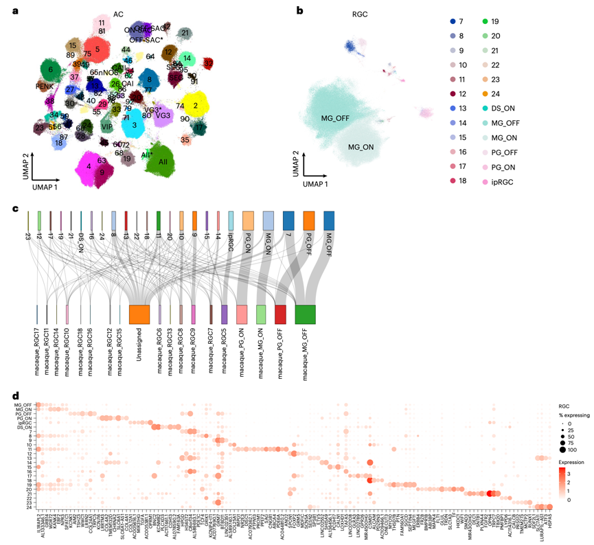 (a) UMAP可视化图展示了已识别的89个AC聚类。(b) UMAP可视化图展示了RGC类型。(c) 桑基图展示了人类(左列)和猕猴(右列)的RGC类型比对情况。(d) RGC类型预测标记的散点图。