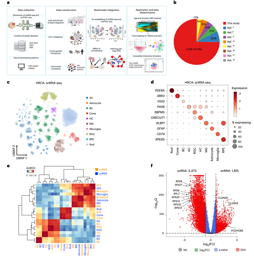 本研究介绍了一个整合的双模态参考图谱,该图谱涵盖了哺乳动物中枢神经系统最易于获取的部分——视网膜。本研究收集了来自125位具有不同祖源背景的供体的约390万个细胞,其中包括8项已发表的研究和270万个未发表的数据点,从而构建了一个包含130多种细胞类型的综合性人类视网膜细胞图谱。本研究对每个细胞簇进行了注释,鉴定了标记基因,并表征了顺式调控元件和基因调控网络。本研究示了不同细胞类型在转录组、染色质和基因调控网络方面的差异。本研究还模拟了基因表达和染色质可及性随年龄、祖源和组织区域的变化。该整合图谱也增强了GWAS和eQTL变异的精细定位。该多模态、多供体、多实验室的人类视网膜细胞图谱可通过交互式浏览器访问,有助于更好地了解视网膜功能和病理。