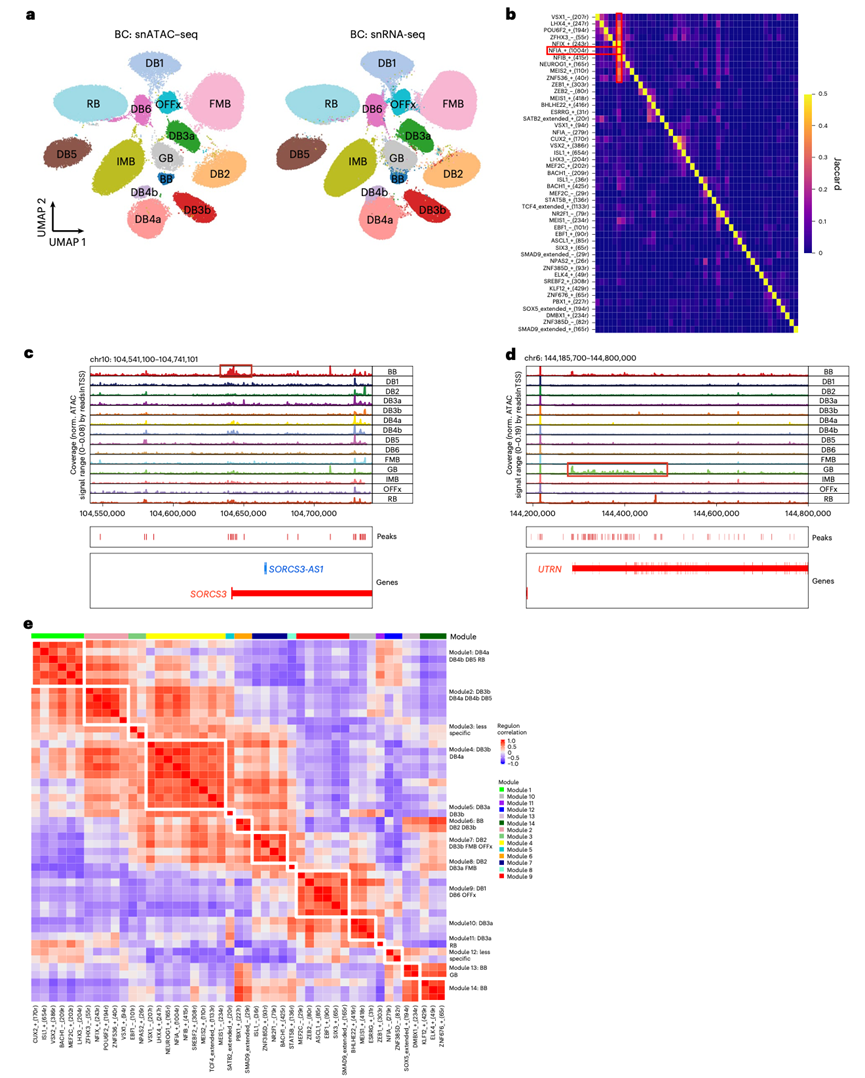 (a) snRNA-seq 和 snATAC-seq 共嵌入细胞的 UMAP 图,显示细胞聚类为 BC 类型。(b) Jaccard 热图,显示已鉴定转录因子靶区域的交集。(c) SORCS3的基因组轨迹,显示SORCS3的启动子在 BB 中高度开放。(d) UTRN的基因组轨迹,显示UTRN的局部染色质在 GB 中高度开放。(e) 热图显示基于靶区域可及性 AUC 值鉴定的调控子的相关性。