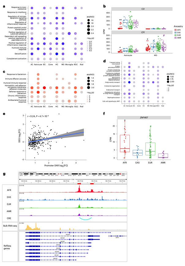 (a, c, d) 富集分析。(b) 不同祖源背景的样本中,星形胶质细胞和髓质细胞中C3和CFI的表达情况。(e) 散点图显示了祖先DAR启动子区域染色质可及性改变与其相关基因表达变化之间的相关性。(f) 箱线图显示了不同祖先背景样本中视锥细胞中ZNF467基因的标准化表达水平。(g) IGV 视网膜 snATAC-seq 和批量 RNA-seq 数据的快照显示祖先 DAR 调控ZNF467,包括启动子区域和与ZNF467相关的 CRE。