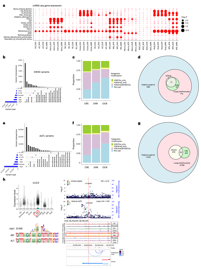 HRCA能够对全基因组关联研究(GWAS)相关的候选致病变异、基因和受影响的细胞类型进行多模态优先级排序。他们鉴定出富集GWAS性状的细胞类别,与snRNA-seq和snATAC-seq的结果一致(图8a)。年龄相关性黄斑变性(AMD)的基因在RPE和小胶质细胞中富集。外节厚度、内节厚度和外核层厚度的基因位点在视杆细胞、视锥细胞、RPE和MG中富集。开角型青光眼相关的性状在MG和星形胶质细胞中富集。屈光不正和近视的基因位点在大多数视网膜细胞类别中均有富集。不同祖先群体的富集模式一致(图8a),表明存在广泛共有的致病变异。