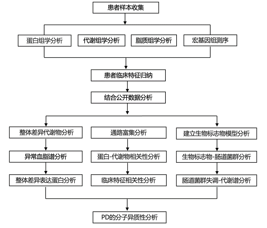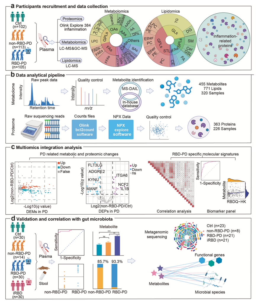 (a) 采用多平台代谢组学和蛋白质组学方法,分析快速眼动睡眠行为障碍(RBD)帕金森病(PD)患者、非RBD-PD患者和健康对照组的血浆分子变化。(b) 共注释了455种极性代谢物、771种脂质以及363种炎症和免疫相关蛋白。(c) 通过整合多组学数据,鉴定了帕金森病相关的代谢和蛋白质组学变化以及RBD-PD特异性分子特征。(d) 在一个独立的临床队列中验证RBD-PD特异性代谢变化后,整合了宏基因组学数据,以鉴定与这些特定的微生物来源代谢物相关的肠道微生物和功能基因。