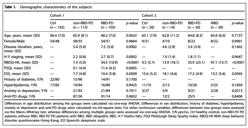 在验证阶段,他们纳入了一个独立的队列(队列 2),该队列由四个年龄和性别匹配的组组成(30 例 RBD-PD 患者、14 例非 RBD-PD 患者、30 例特发性RBD(iRBD) 患者和 30 例对照组受试者,所有受试者均接受了金标准多导睡眠检测 (vPSG) 评估以确认 RBD 状态。正如预期的那样,虽然非 RBD-PD 患者和 RBD-PD 患者的日间嗜睡程度似乎相当(表1),但RBD-PD 组和 iRBD 组的 RBD 症状均比非 RBD-PD 组更为严重。