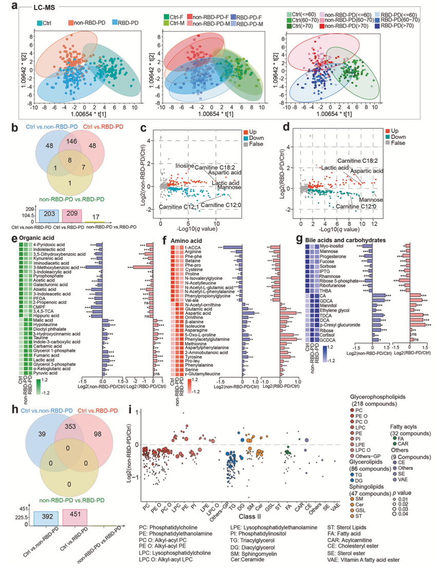 (a) 基于液相色谱-质谱(LC-MS)代谢谱,构建了两个帕金森病亚组和对照组个体的正交偏最小二乘判别分析(OPLS-DA)模型。(b) 维恩图展示了组间比较中鉴定出的差异表达代谢物的数量。(c) 火山图展示了非RBD PD患者与对照组相比,差异表达代谢物的显著变化。(d) 火山图展示了RBD帕金森病组与对照组相比,差异表达代谢物的显著变化。(e-g) 非RBD-PD相关差异表达代谢物(例如有机酸、氨基酸、胆汁酸和碳水化合物)的相对浓度热图。(h) 维恩图,显示组间比较中差异脂质的数量。(i) 按化学类别分类的非RBD-PD患者差异脂质的气泡图。