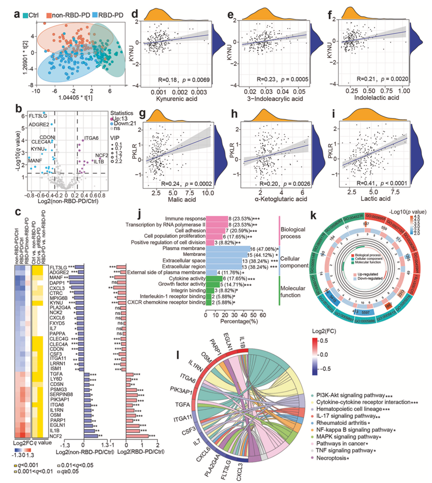 (a) 基于蛋白质组学特征,构建了两个PD亚组和健康对照者的OPLS-DA模型。(b) 火山图可视化了非RBD-PD患者与健康对照者之间的差异表达蛋白。(c) 热图可视化了34种PD差异表达蛋白在三个组别中的表达情况。(d-f) KYNU与代谢物(犬尿酸、3-吲哚丙烯酸和吲哚乳酸)之间的相关性分析。(g-i) PKLR与代谢物(苹果酸、α-酮戊二酸和乳酸)之间的相关性分析。(j-k) GO分析。(l) DEP中前9个富集的KEGG通路。