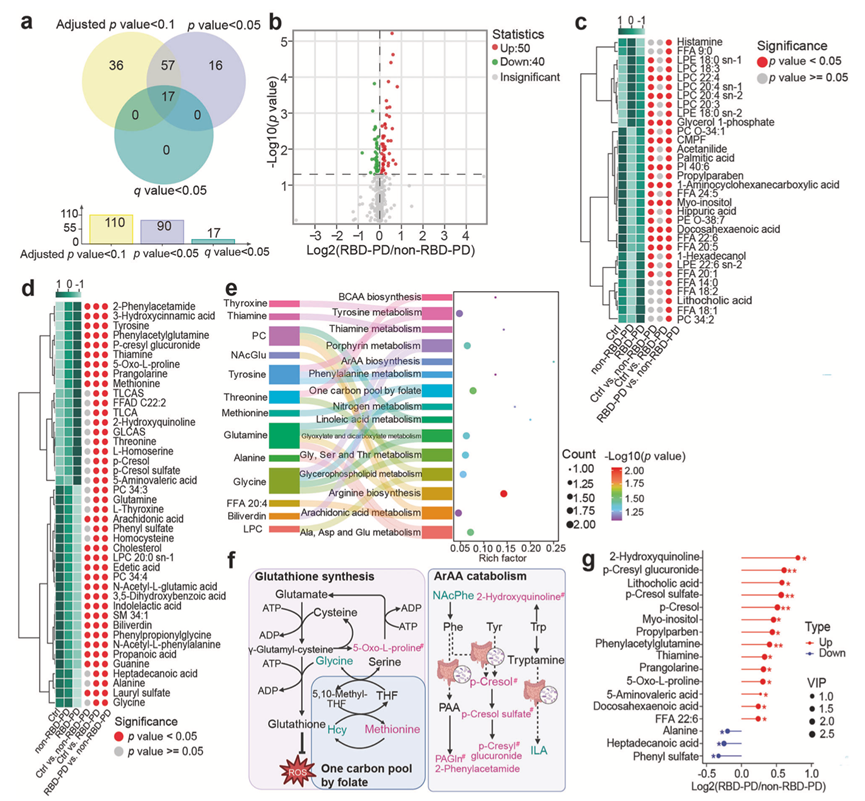 为了研究亚型异质性,他们比较了RBD-PD患者和非RBD-PD患者的代谢谱。采用逻辑回归分析,校正了潜在的混杂因素,包括糖尿病史、高脂血症、焦虑/抑郁状态和抗帕金森病药物治疗,结果显示有110种DEM(图4a)。Mann-Whitney U检验鉴定出90种代谢物(图4b),其中74种在两种方法中均有发现(图4c-d)。与非RBD-PD患者和健康对照组相比,RBD-PD患者的极性代谢物(包括氨基酸、有机酸和次级胆汁酸)的改变更为显著(图4d)。相反,非RBD-PD患者的脂质代谢紊乱更为严重(图4c)。为了全面分析与RBD-PD相关的代谢通路,他们重点关注了呈现渐进性变化的代谢物(图4d),这些代谢物主要参与氨基酸代谢和叶酸途径的单碳库(图4e)。与非RBD-PD患者相比,RBD-PD患者体内蛋氨酸、高丝氨酸、苏氨酸和5-氧代脯氨酸显著积累,而甘氨酸水平显著降低。此外,RBD-PD患者体内还检测到肠道菌群来源的代谢物显著富集,包括次级胆汁酸、2-苯乙酰胺、2-羟基喹啉、对甲酚、对甲酚硫酸酯、对甲酚葡糖醛酸苷和苯乙酰谷氨酰胺(图4f)。此外,RBD-PD患者的乙酰化氨基酸(N-乙酰-L-谷氨酸,NAcGlu;N-乙酰-L-苯丙氨酸,NAcPhe)和色氨酸衍生的ILA水平显著降低。经多重比较校正后,仍有17种代谢物发生显著变化(图4g),主要为芳香族氨基酸(ArAA)衍生的肠道菌群代谢物。
