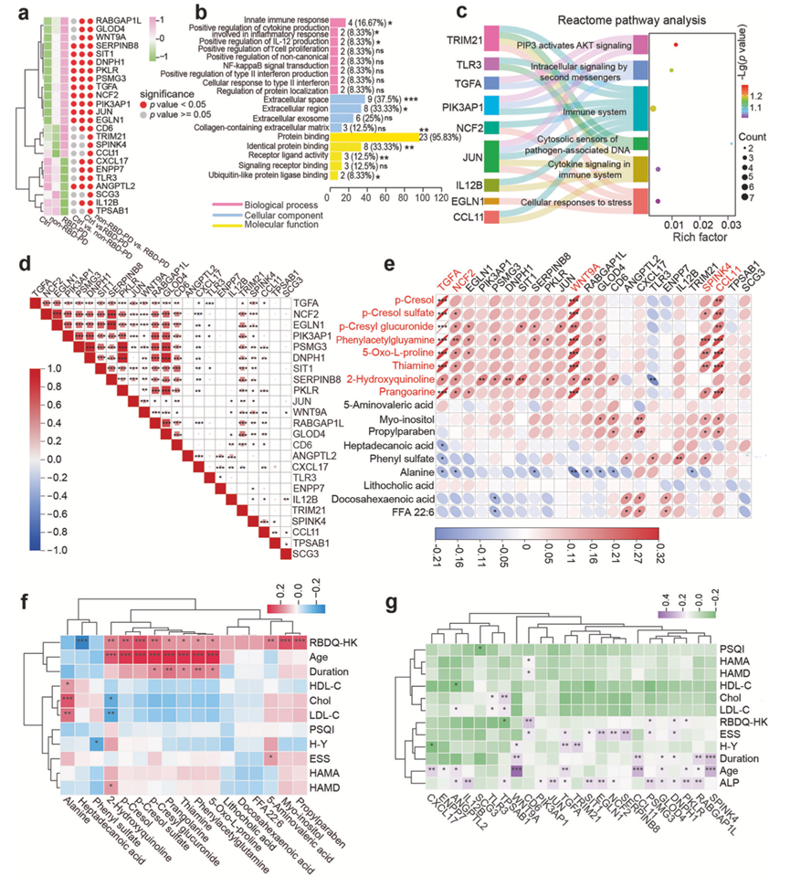 (a) 三组间DEP的相对浓度变化,以及 RBD 患者与非 RBD 患者之间组间比较的统计学意义。(b) GO分析。(c) 通路富集分析。(d) 对 24 个 RBD-PD 相关 DEP 进行 Pearson 相关性分析。(e) 对 RBD-PD 患者中 24 个 DEP 与 17 个DEM进行 Pearson 相关性分析。(f) RBD-PD患者前17个DEM与患者临床特征的Pearson相关性分析。(g) RBD-PD相关24个DEP与患者临床特征的Pearson相关性分析。