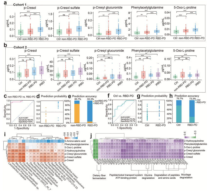 在由经vPSG确诊的非RBD-PD、RBD-PD或iRBD患者以及健康对照组组成的独立临床队列(队列2)中,从队列1中鉴定的17种主要代谢物中有10种表现出一致的趋势。值得注意的是,其中5种代谢物,包括对甲酚、对甲酚硫酸盐、对甲酚葡糖醛酸苷、苯乙酰谷氨酰胺和5-氧代-L-脯氨酸,在RBD-PD和iRBD患者中均显著升高(图7a-b)。