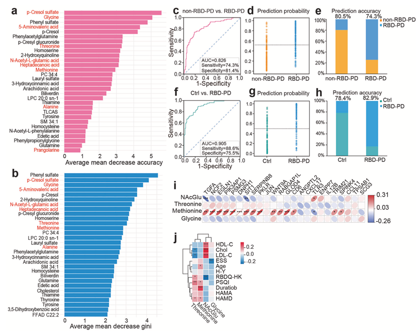 (a) 随机森林识别的前30个特征的平均准确率下降值。(b) 随机森林鉴定的前30个特征的平均基尼系数下降值。(c) ROC曲线评估生物标志物模型区分两种PD临床亚型的性能。(d-e) 分类模型区分两种临床亚型的预测概率和预测准确率。(f) ROC曲线评估分类模型区分RBD-PD患者和对照组个体的性能。(g-h) 分类模型区分RBD-PD患者和对照组个体的预测概率和预测准确率。(i) 代谢物水平与 24 种DEP水平之间的 Pearson 相关性。(j) 代谢物水平与临床参数之间的 Pearson 相关性。