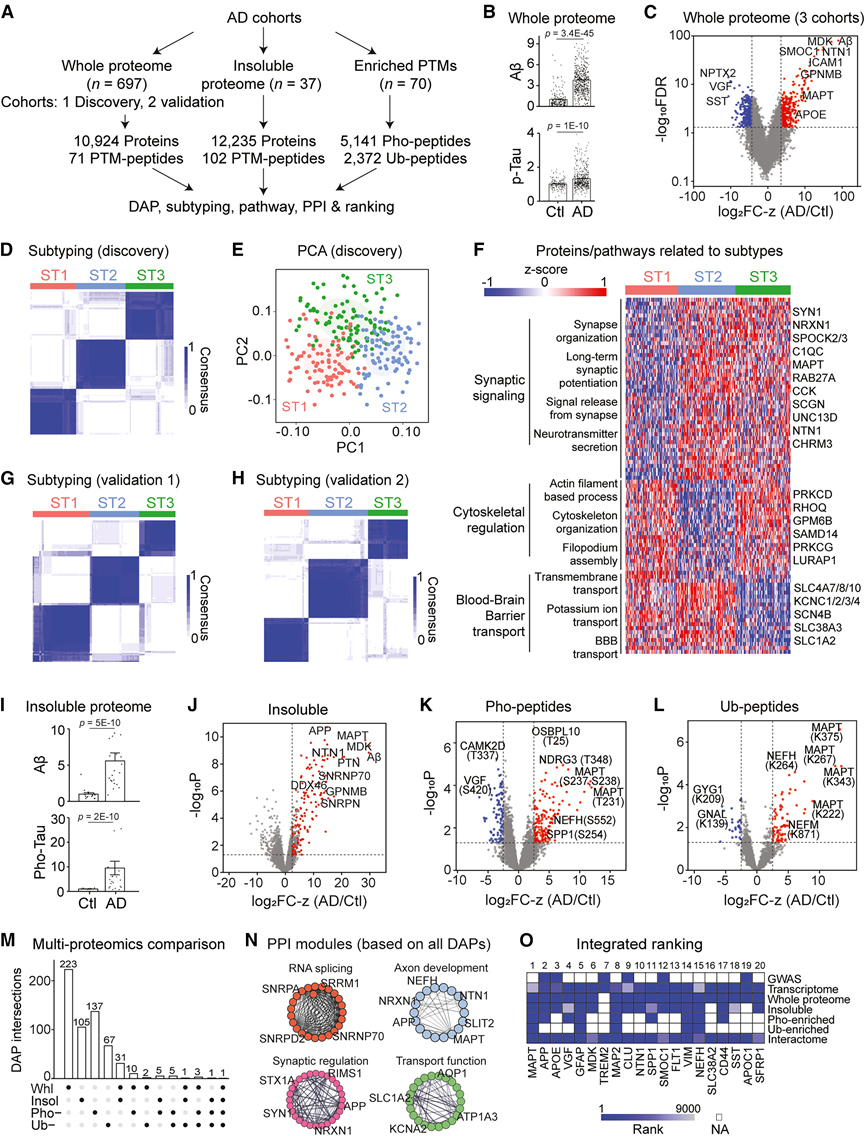 (A) 描述 AD 队列分析的工作流程。(B) 蛋白质组中Aβ和pTau的水平。(C) 火山图展示了三个队列中的 DAP。(D) 共识聚类显示发现队列中的三种 AD 亚型。(E) 发现队列中三个亚型的 PCA 图。(F) 蛋白质/通路与 AD 亚型关联的热图。(G-H) 共识聚类显示验证队列中的三种 AD 亚型。(I) 不溶性蛋白质组中Aβ和pTau的水平。(J-L) 火山图显示了不溶性蛋白质组、富集磷酸化蛋白质组和泛素组数据集中的 DAP。(M) UpSet 图显示了多层蛋白质组学中 DAP 的交集。(N) 基于组合DAP的选定PPI网络。(O) 对多个 AD 数据集中的蛋白质/基因进行综合排名。