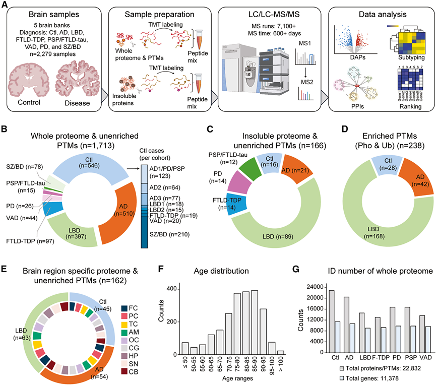 (A) 实验工作流程示意图。(B) 不同ND患者全蛋白质组样本的分布。(C) ND中不溶性蛋白质组样品的分布。(D) 富集的PTM样本分布,显示了磷酸化富集(Pho)和泛素化富集(Ub)的修饰。(E) 脑区样本分布。(F) 脑捐献者的年龄分布。(G) 对ND患者蛋白质组中鉴定的蛋白质/未富集的PTM及其对应基因进行计数。