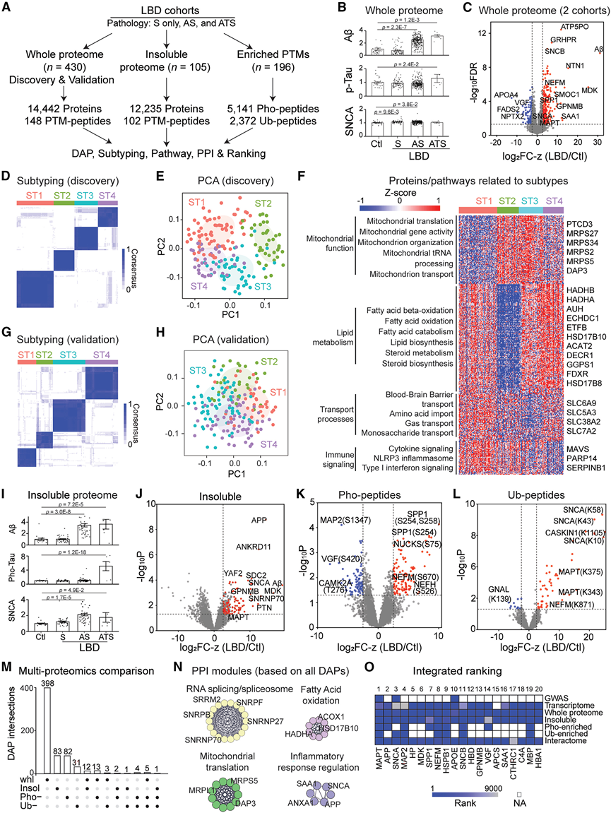 (A) LBD队列分析的工作流程。(B) 全蛋白质组中Aβ、pTau和SNCA的水平。(C) 两个 LBD 队列中的DAP。(D) 共识聚类显示发现队列中的四种 LBD 亚型。(E) 发现队列中四个亚型的 PCA 图。(F) 蛋白质/通路与亚型关联的热图。(G-H) 共识聚类和 PCA 图显示验证队列中的四种 LBD 亚型。(I) 不溶性蛋白质组中 Aβ、pTau 和 SNCA 的水平。(J-L) 不溶性蛋白质组、磷酸化蛋白质组和泛素组数据集中的DAP。(M) UpSet 图显示了多层蛋白质组学中 DAP 的交集。(N) 基于组合DAP的选定PPI网络。(O) 对多个数据集中的蛋白质/基因进行综合排名。