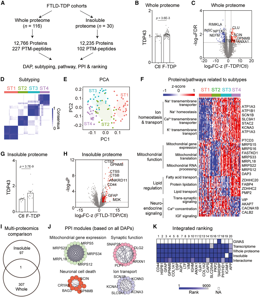 (A) 描述 FTLD-TDP 队列分析的工作流程。(B) 全蛋白质组中TDP-43的水平。(C) FTLD-TDP 中整个蛋白质组的 DAP。(D) FTLD-TDP 样本的共识聚类。(E) PCA 图显示了四种亚型的分布。(F) 蛋白质/通路与四种 FTLD-TDP 亚型关联的热图。(G) 不溶性蛋白质组中TDP-43的水平。(H) 不溶性蛋白质组中的DAP。(I) 在全蛋白质组和不溶性蛋白质组中鉴定的 DAP 的重叠。(J) 基于组合DAP的选定PPI网络。(K) 对多个 FTLD-TDP 数据集中的蛋白质/基因进行综合排名。
