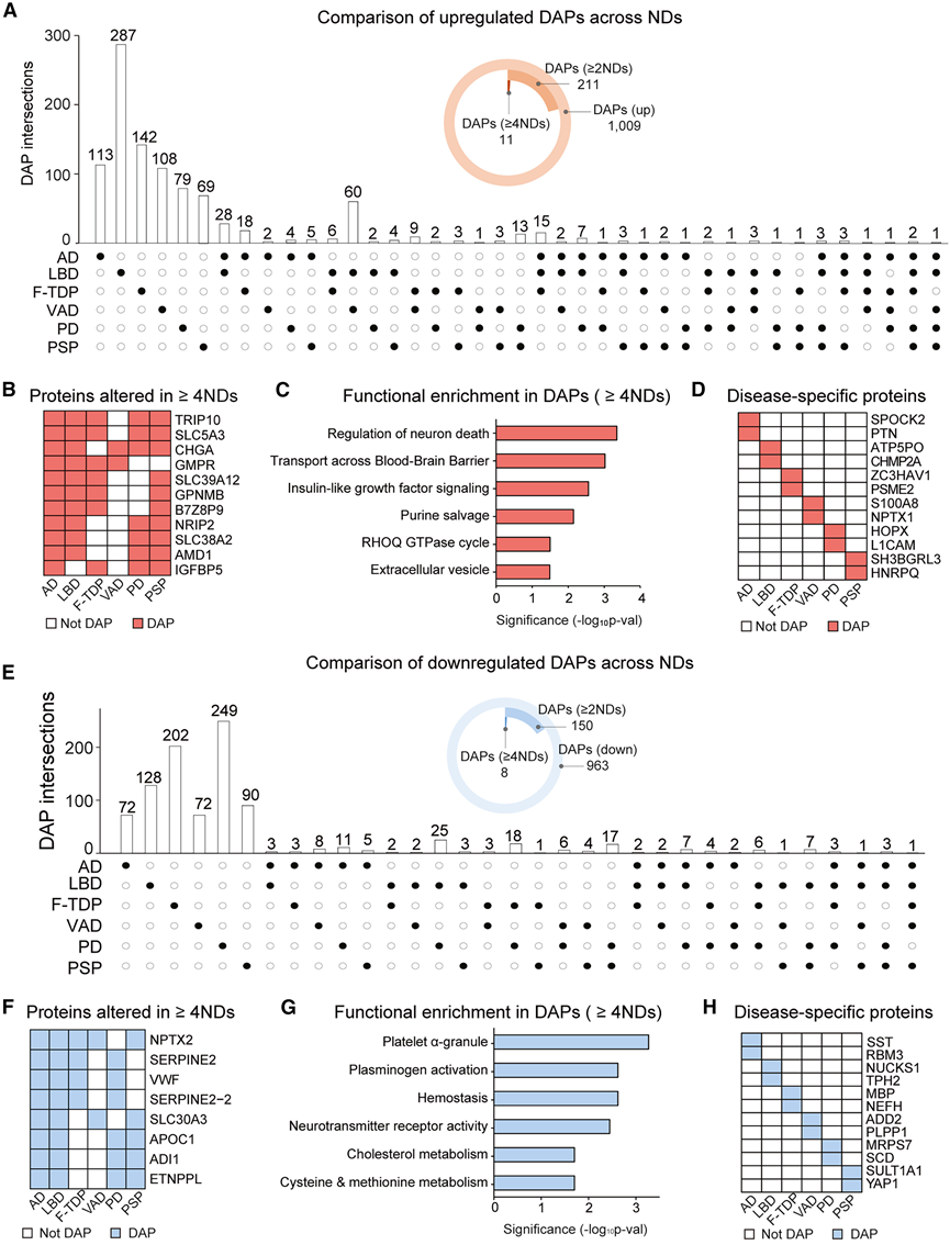 (A) UpSet 图比较 ND 中上调的 DAP。(B) 热图显示在至少四个ND中上调的蛋白质。(C) 使用 Enrichr 对至少在四种 ND 中上调的 DAP 进行功能富集分析。(D) 针对每种 ND 选择的疾病特异性上调蛋白的热图。(E) UpSet 图比较 NDs 中下调的 DAP。(F) 热图显示在至少四个ND中表达下调的蛋白质。(G) 对至少在四个 ND 中下调的 DAP 进行功能富集分析。(H) 针对每种 ND 选择的疾病特异性下调蛋白的热图。