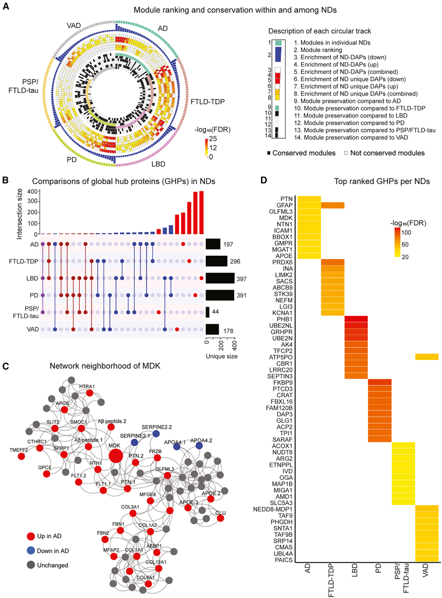 为了鉴定驱动这些共表达网络的关键调控因子,他们对MEGENA网络进行了关键驱动因子分析,以确定整体关键蛋白(GHP)。结果显示,AD、LBD、FTLD-TDP、PSP、VAD和PD分别有197、397、296、44、178和391个GHP(图6B)。具体而言,MDK在AD共表达网络中位列GHP前列(图6C),且MDK子网络激活,因为其许多连接节点在全蛋白组和不溶性蛋白组中均上调。Western blot进一步验证了MDK在AD脑组织中的积累,免疫染色证实了其在淀粉样斑块中的定位。该子网络中存在来自多个阿尔茨海默病风险基因的蛋白质,包括APOE、APP和CLU。总体而言,GHP也具有很强的疾病特异性,不同疾病之间的重叠有限(图6D)。