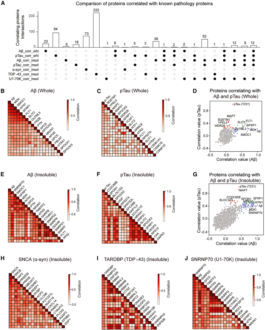 (A) 比较不同蛋白质组数据集(全蛋白质组和不溶性蛋白质组)中与 Aβ、pTau、SNCA、TDP-43 和 U1-70K 显著相关的蛋白质。(B-C) 在整个蛋白质组中与 Aβ 和 pTau 相关性最高的 20 种蛋白质。(D) 散点图显示蛋白质与Aβ和pTau的相关系数。(E-G) 对不溶性蛋白质组进行类似分析,显示相关系数 >0.4 的蛋白质。(H-J) 不溶性蛋白质组中与 SNCA 、TDP-43和 U1-70K相关性最高的 20 个蛋白质。